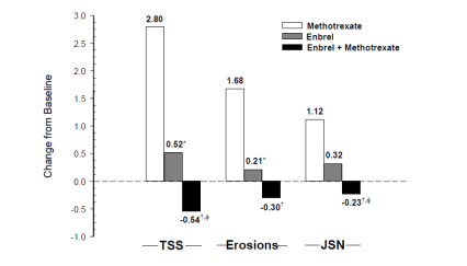 У цьому дослідженні структурне ушкодження суглобів оцінювалося рентгенологічно і виражалося як зміна загального показника Шарпа (Total Sharp Score (TSS)) та його компонентів: показника ерозивного ураження у балах та звуження суглобової щілини (JSN). Рентгенограми руки/зап'ястка і стопи були отримані перед початком дослідження та через 6, 12 і 24 місяці. Енбрел ліо у дозі 10 мг завжди демонстрував менш виражений вплив на структурне ушкодження суглобів, ніж у дозі 25 мг. Енбрел ліо у дозі 25 мг мав достовірну перевагу перед метотрексатом з точки зору показника ерозивного ураження через 12 та 24 місяці. Відмінності у показниках TSS і JSN при застосуванні метотрексату і препарату Енбрел ліо 25 мг не були статистично достовірними. Результати цього дослідження представлені на рисунку 1.