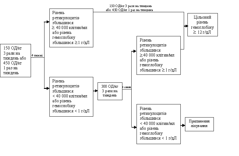 Якщо після 4 тижнів застосування початкової дози рівень гемоглобіну збільшився як мінімум на 1 г/дЛ (0,6 ммоль/л) (або рівень ретикулоцитів збільшився до ≥ 40 000 клітин/мл), доза має залишатися 150 ОД/кг 3 рази на тиждень або 450 ОД/кг підшкірно 1 раз на тиждень. Якщо після 4 тижнів застосування початкової дози рівень гемоглобіну збільшився на 1 г/дЛ (0,62 ммоль/л) або рівень ретикулоцитів збільшився до ˂ 40 000 клітин/мл, дозу необхідно збільшити до 300 ОД/кг три рази на тиждень або 40 000 ОД 1 раз на тиждень.